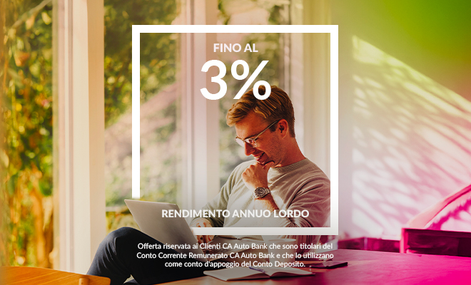 Messaggio pubblicitario con finalità promozionale 1Offerta valida fino al 29/4/’26 e soggetta ad approvazione della Banca, solo per i Clienti che non abbiano attivato altri Conti Correnti CA Auto Bank prima del 31/3/’26.